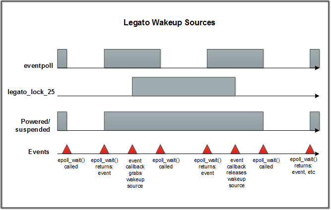 This way, callbacks for this fdMonitor event will be executed while eventpoll wakeup source is held. This guarantees the system stays awake until all callbacks are executed. If a Legato component needs to keep the system powered beyond the scope of a Legato callback, it should acquire its own wakeup source.